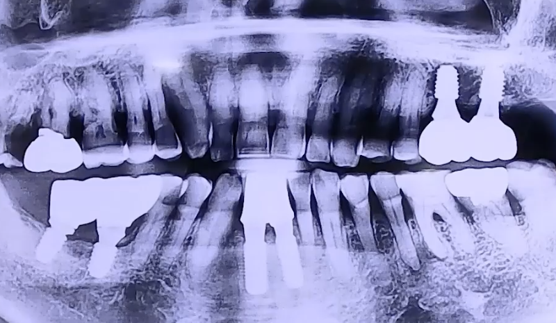 아래 앞니의 통증을 호소하며 내원해 주셨던 환자분이십니다. 통증을 느끼는 쪽 치아가 흔들리고 계셨고, 오른쪽 아래 어금니가 예전에 발치하셔서 없으며 왼쪽은 위 어금니가 하나만 남아있었는데요. 오른쪽 아래 어금니가 없기 때문에 오랫동안 왼쪽으로 식사하신 영향으로 왼쪽 치아 상태도 점점 약해지면서 앞니 쪽으로 식사를 하게 되셨던 것으로 확인되었습니다. 좌우 골고루 치아를 사용하실 수 있도록 오른쪽 아래 어금니, 왼쪽 위 어금니에 임플란트 치료를 진행하시고, 약해졌던 앞니도 얇은 임플란트로 치료해 드렸습니다. |