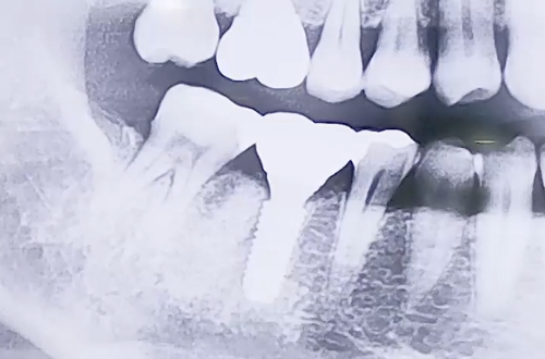 오른쪽 아래 큰 어금니가 굉장히 심하게 붓고 통증이 있는 상태로 내원해 주신 환자분의 사례로, 해당 치아의 흔들림이 심했습니다. 엑스레이를 찍어보니 어금니의 뿌리 중 하나의 주변으로 염증이 생기면서 치아를 단단히 잡아주는 힘이 약해져 흔들리고 통증이 있던 것이었는데요. 때문에 발치 후 임플란트를 시행하기로 하였으나, 발치한 자리 가운데에 식립하기에는 염증으로 약해진 잇몸이 고민스러웠습니다. 때문에 염증을 피해 살짝 옆쪽으로 심고, 염증 부분은 치료한 뒤 뼈이식으로 정리해 드리는 방향으로 치료해 드렸습니다. |