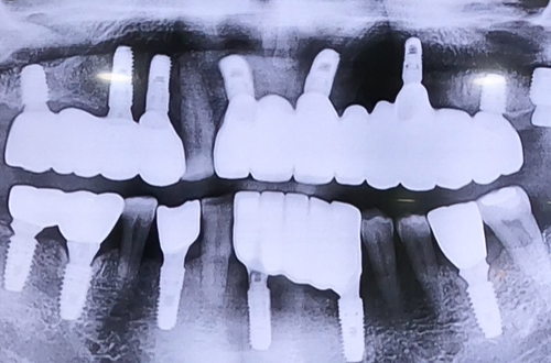 대부분의 윗니가 심하게 흔들린 후 빠진 상태이고, 남은 윗니들도 빠지기 직전인 상태로 내원하신 환자분입니다. 아랫니 상태는 양호하였으므로 상태가 많이 안 좋은 윗니의 전체 임플란트 치료를 진행하게 되셨는데요. 검사를 해 보니 오른쪽 위 송곳니는 단단하게 상태가 좋았으므로 해당 송곳니를 남겨두고 나머지 전체 임플란트를 하기로 결정했습니다. 임플란트 치료는 시간이 걸리는 치료이고, 그 기간 동안 임시 치아를 해드리지만 저작기능을 제대로 발휘할 수 없으므로, 불편함을 덜어드리기 위하여 씹을 수 있는 치아가 남아 있다면 그 치아를 남기고 전체임플란트를 합니다. 임플란트 식립 후 4개월 간 굳는 기간을 기다리고 예쁘게 보철까지 완성해 드렸습니다. |