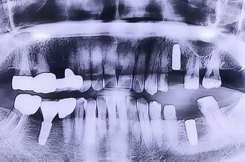 브릿지 제거 후 위아래 남은 양옆의 치아들은 보철로 이를 둘러 씌워주고 임플란트 치료를 마무리해드렸습니다.